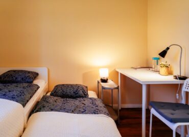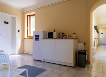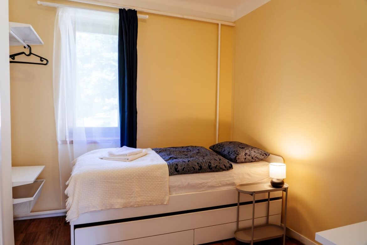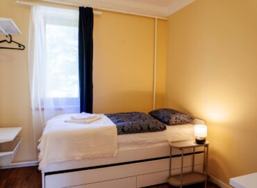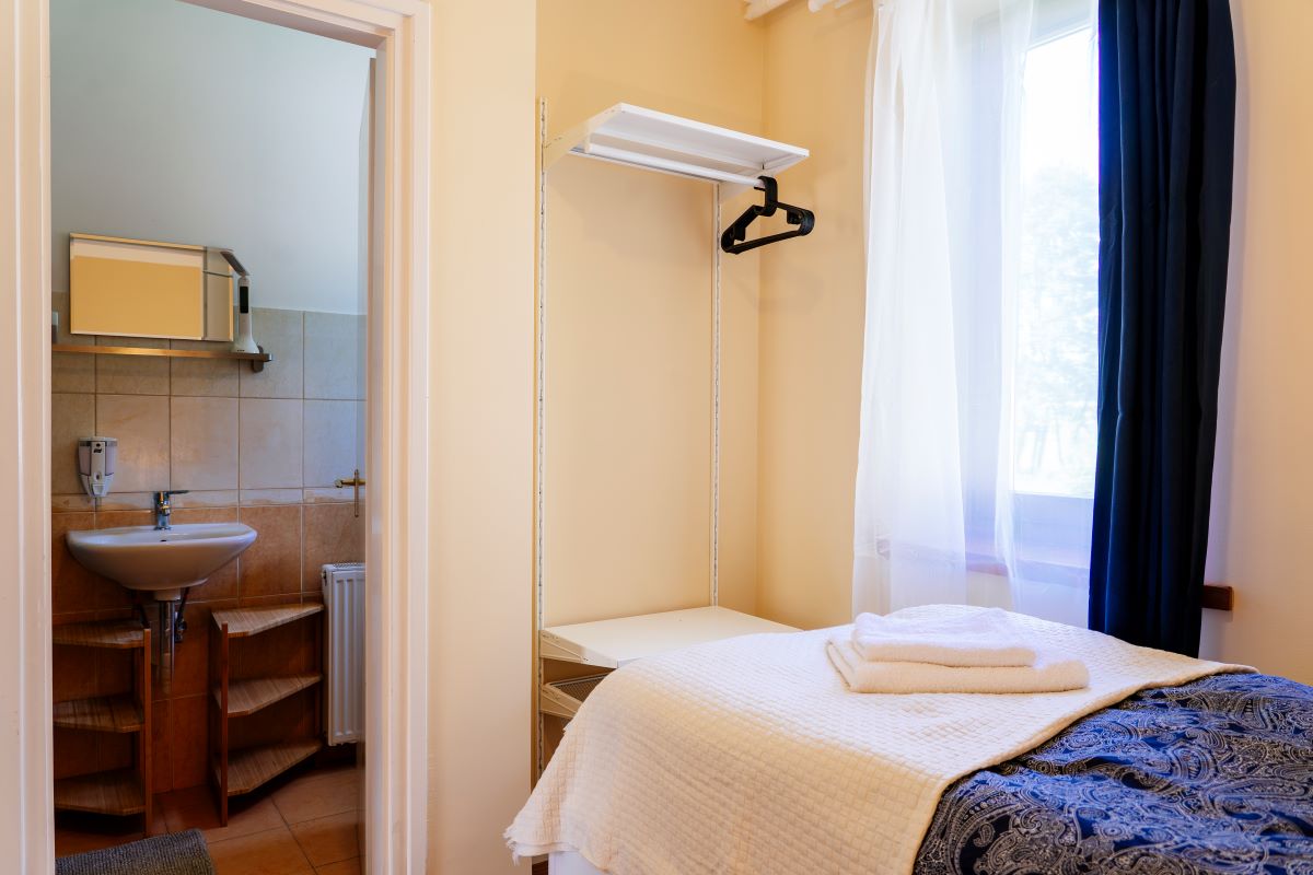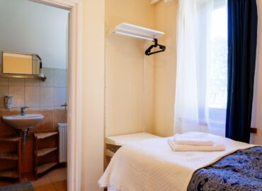 A szobában egy kényelmes, különálló ágy, egy kis asztal székkel, valamint egy akasztós állvány polcokkal gondoskodik a praktikus tárolásról. Szükség esetén az ágy kinyitható, és két személy kényelmes elhelyezését biztosítja, bár ez a szoba mérete miatt kissé szűkössé teheti a teret. Az asztalon egy kancsó friss víz és poharak várják a vendégeket, hogy felfrissüljenek egy hosszú nap után. A meghitt hangulatot egy kis asztali lámpa és egy színes, ízléses virágdísz fokozza. Az ágy mellett található éjjeli szekrényen egy kis lámpa segít az éjszakai tájékozódásban, biztosítva a maximális kényelmet.