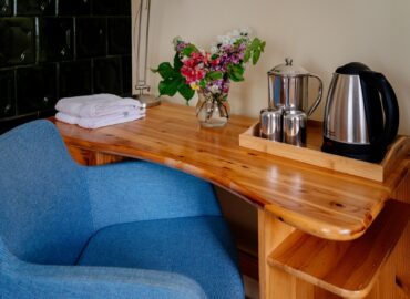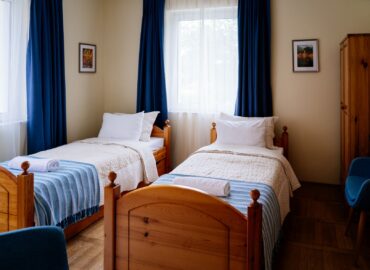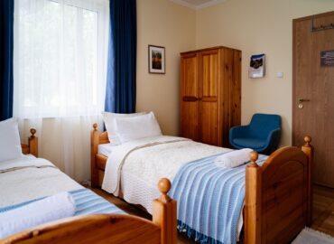 A szobában két különálló ágy, egy íróasztal két fotellel és egy ruhás szekrény található, mind fenyőfából készült, igényes bútorokból. Az asztalon egy vízforraló és egy kancsó víz poharakkal várja a fáradt látogatókat, hogy enyhítse szomjukat. Bögréket, kiskanalat, teafüvet és cukrot is találsz a vízforraló mellett. Egy kis lámpa meleg, meghitt fényt áraszt, és ha lehetséges, mindig friss virág díszíti a vázát.