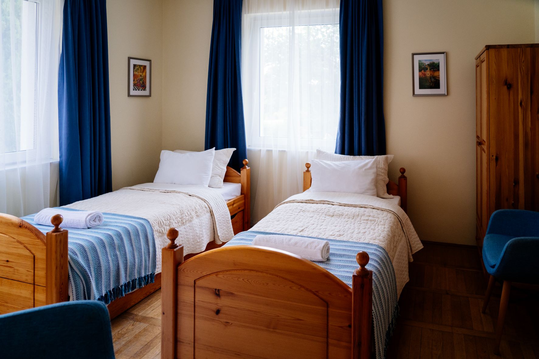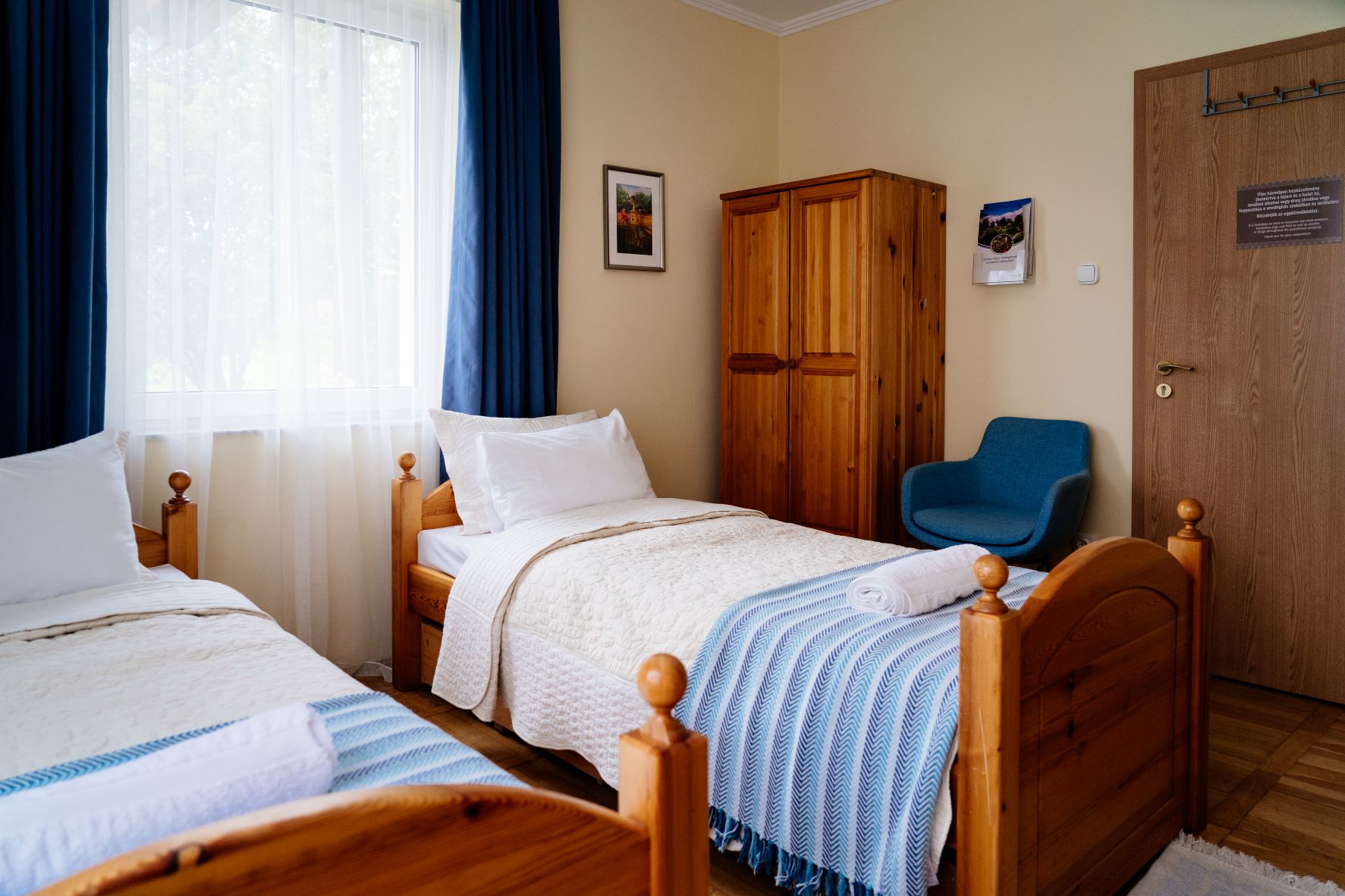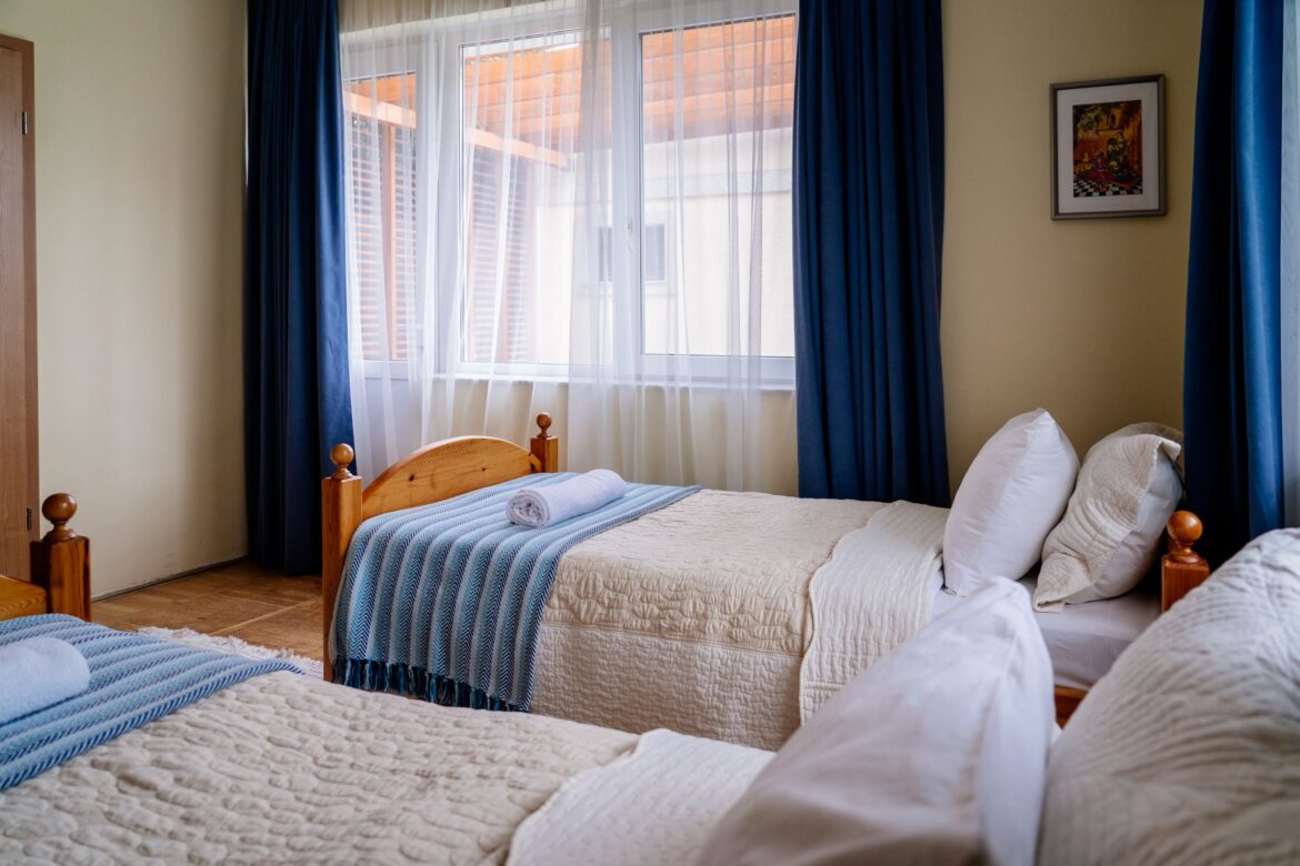 A szobában két különálló ágy, egy íróasztal két fotellel és egy ruhás szekrény található, mind fenyőfából készült, igényes bútorokból. Az asztalon egy vízforraló és egy kancsó víz poharakkal várja a fáradt látogatókat, hogy enyhítse szomjukat. Bögréket, kiskanalat, teafüvet és cukrot is találsz a vízforraló mellett. Egy kis lámpa meleg, meghitt fényt áraszt, és ha lehetséges, mindig friss virág díszíti a vázát.