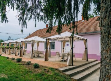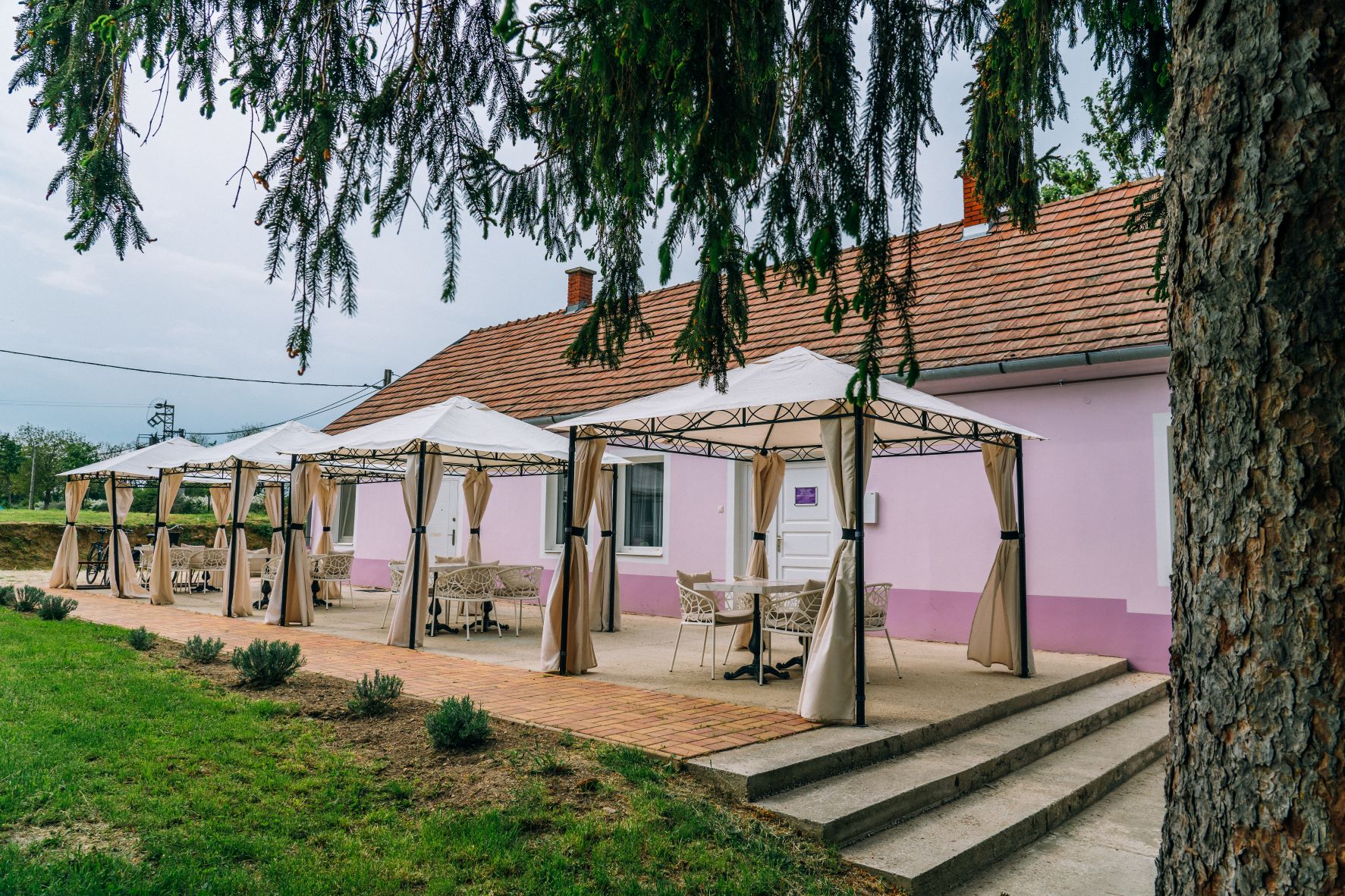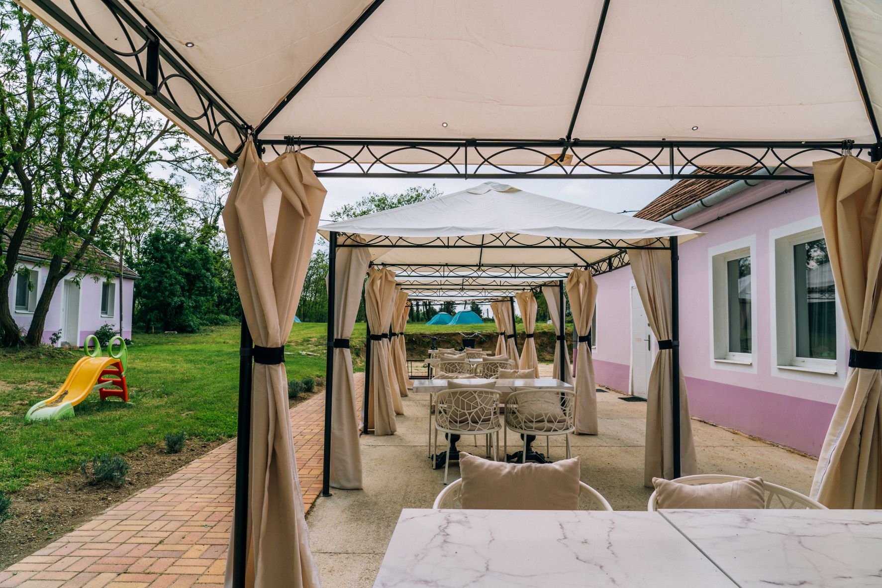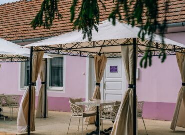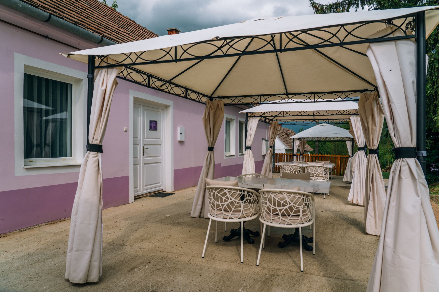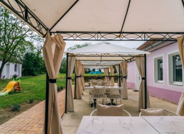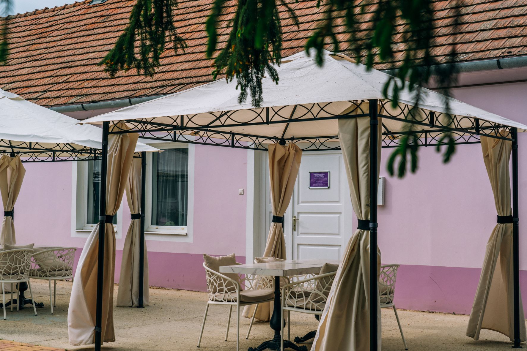 In front of the building is a cozy terrace with tables, cushioned chairs and tent roofs. In good weather, it provides an ideal place for guests to relax and recharge.